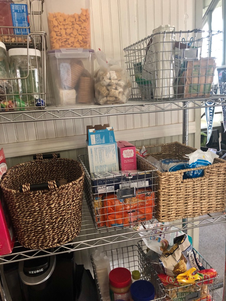 Baskets come in handy as well when you are organizing food and other kitchen supplies. We do not have a pantry, but in place of that we use a metal shelving stand. Whether you have a pantry or just some shelves, find containers that fit with your space. Corral like items together. Crackers stay fresh longer placed in sealed containers. Snacks can be organized together in a one section and beverages in another.