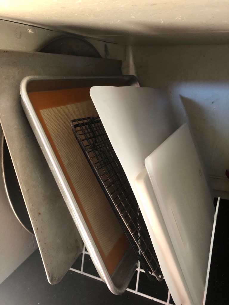 I do not have a built-in area for conveniently storing items such as my baking sheets, but a dish drying rack from The Dollar Store, is a good substitute, but it will get out of shape after awhile. If you can spend a bit more money you can use a bamboo pot lid holder, which is what I am currently using. I bought mine on Amazon.