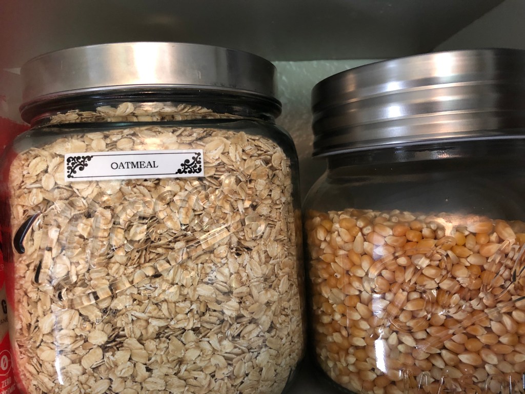 I have tried to donate items in my kitchen that I don’t use often, partly because we have limited space. Therefore, being short on space and with a limited budget, I have had to be creative. One effective way I have learned to use my space is with clear glass canning jars of different shapes and sizes for storage. They work great because you can see how much is left in them, so I know when I need to go to the store to replenish my food items. I use them for flour, sugar, chocolate chips, oatmeal, baking soda, baking powder, nuts, popcorn etc.