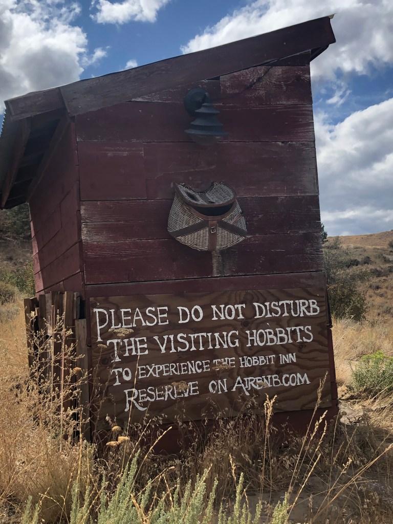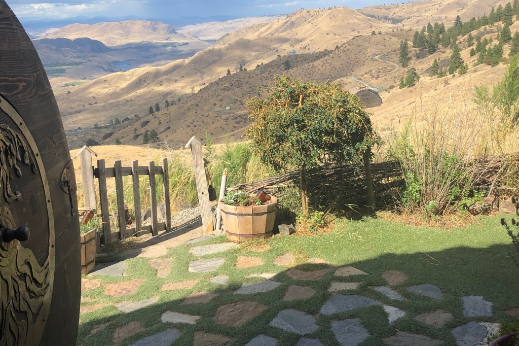 It was a secret dream of mine to stay in a hobbit hole. I hadn’t voiced this before, except telling my family I wanted to visit New Zealand someday where they filmed my favorite movie. Last year knowing how much of a Lord of the Rings fan I was, my husband, Dan, found a place to stay called the Hobbit Inn located in Orondo, Washington. He managed to keep it a secret from me until we were an hour or two away from our destination. After we arrived, I couldn’t keep from smiling which progressed into happy tears as I saw what would be our place to stay for the night for our anniversary. The attention to detail was amazing. When you walked up the long, winding path, you came to a small fence and gate. As you entered there was a small yard and garden with hobbit-sized tools and walking sticks. But the real star was the front door. The green door was large and round-much bigger than in the book. The builders scaled it so the room would be big enough for us humans.