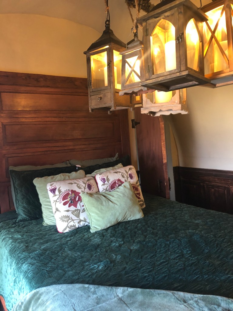 When you walked through the round hole, an ornate bed greeted us with a chandelier made from lanterns you could easily wack your head on if you weren’t careful as you were getting up on the bed. The hobbit hole fortunately came with a fully functioning bathroom and a small sitting area with a fireplace. Across from the sitting area stood a side table with an electric kettle for tea (you had to turn off the electricity and use the generator, because the kettle took too much juice to run) and a place to whittle a piece of wood. I tried my hand at whittling, but my owl did not turn out well. My son affectionately named it “Beaver Attack” when he saw the results I brought home.
