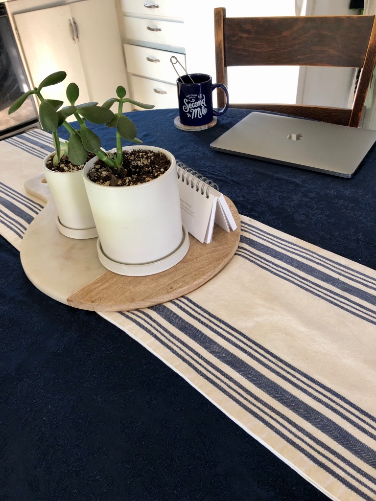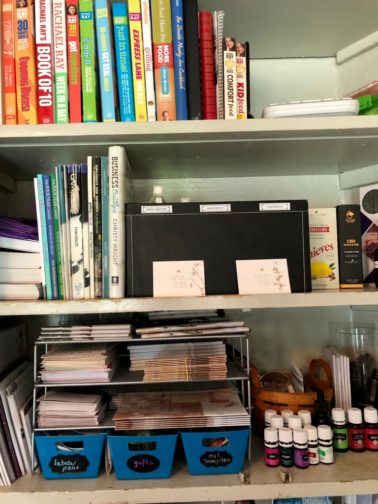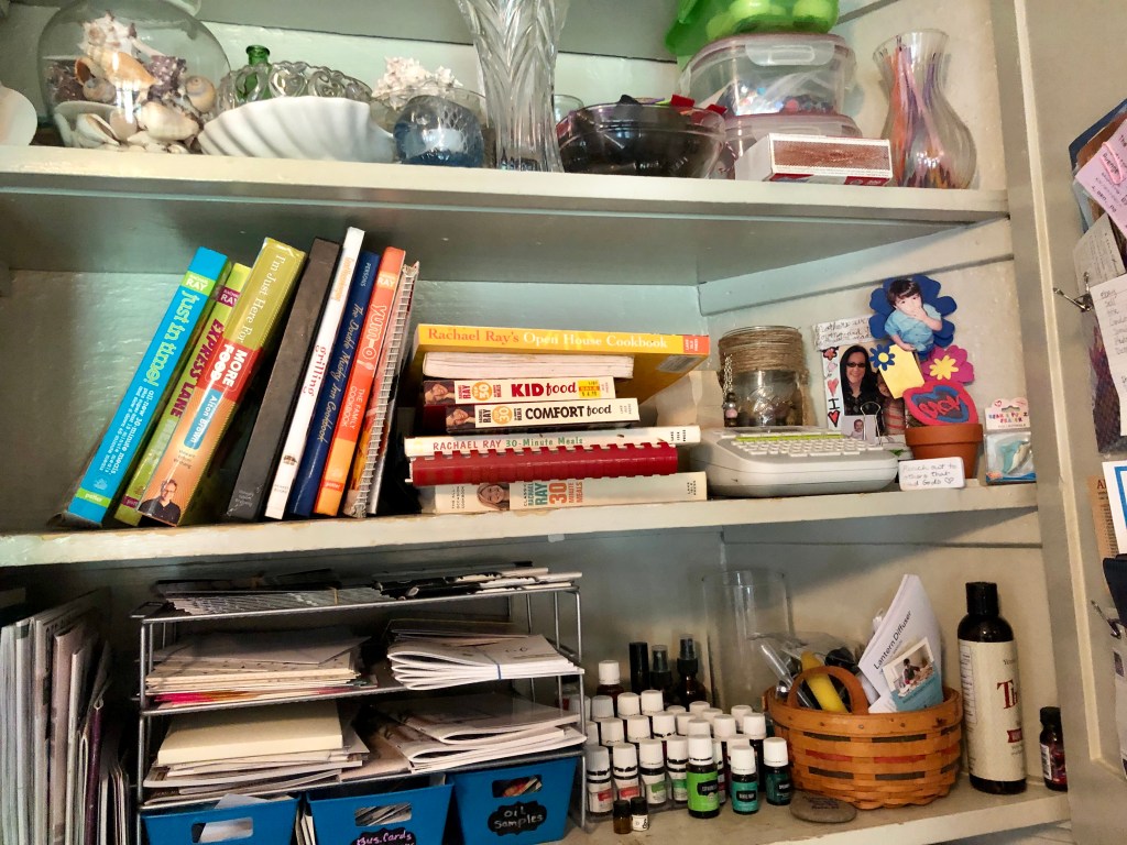 The last step was acknowledging my workspace wasn’t functioning effectively for me. My kitchen table was home to my calendar and daily plans, plus notebooks and other business items. In addition, this table occasionally served as another work area for meal prep. This arrangement wasn’t working, so I finally decided to do something about it. I don’t have room for a desk, but I improvised a nook we have in a corner of the kitchen. You learn to be creative when you have fewer resources, like space, in your house. I utilized the nook as a place to keep my calendar and planner, and I made it inviting using pictures, memorabilia, and Christmas lights. I also moved my cookbooks to another shelf to free up more space for my business. I already had the trays stacked upside down and the small containers to help with storage, I just had to reorganize them. Moving my work to another area freed up my space at the table. Now when I sit at the table, I feel more focused and inspired to write. You will discover me here more often writing and sipping on a cup of tea.