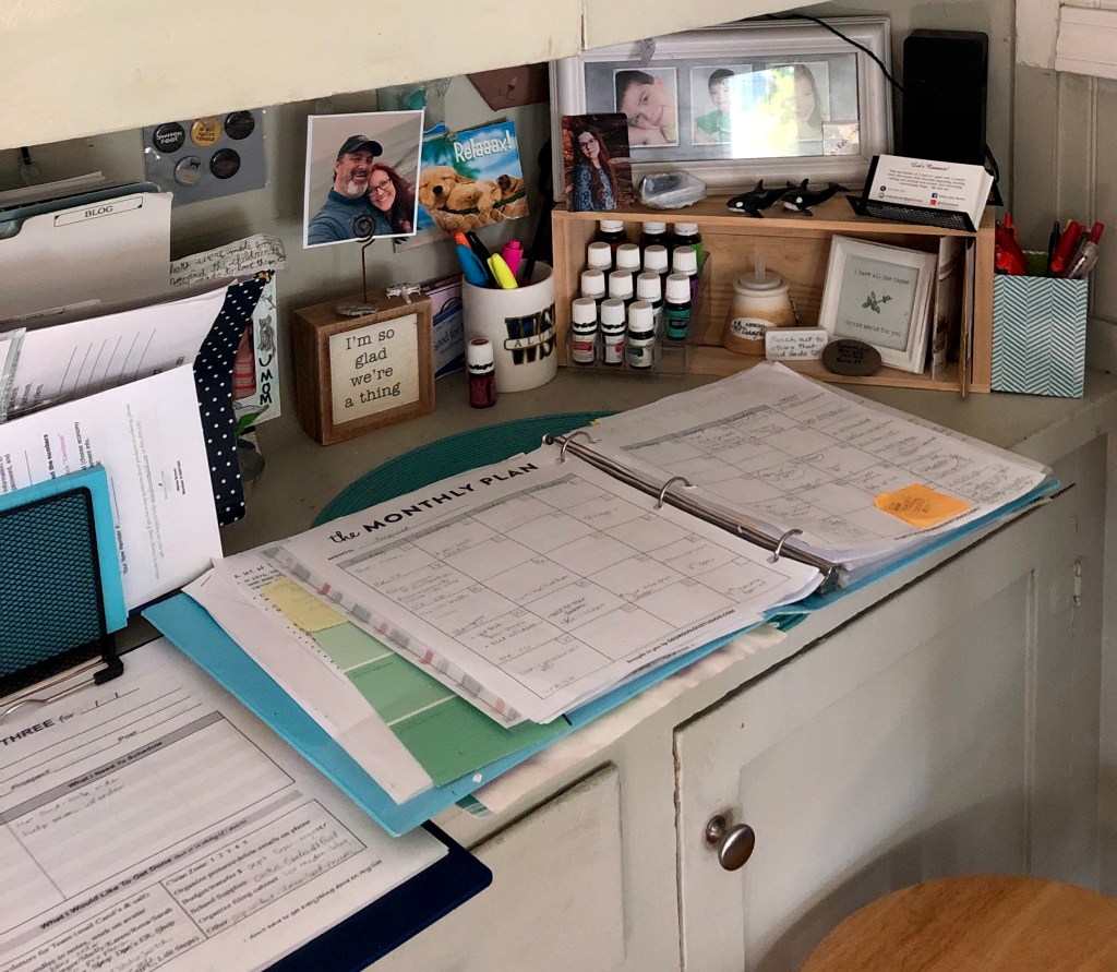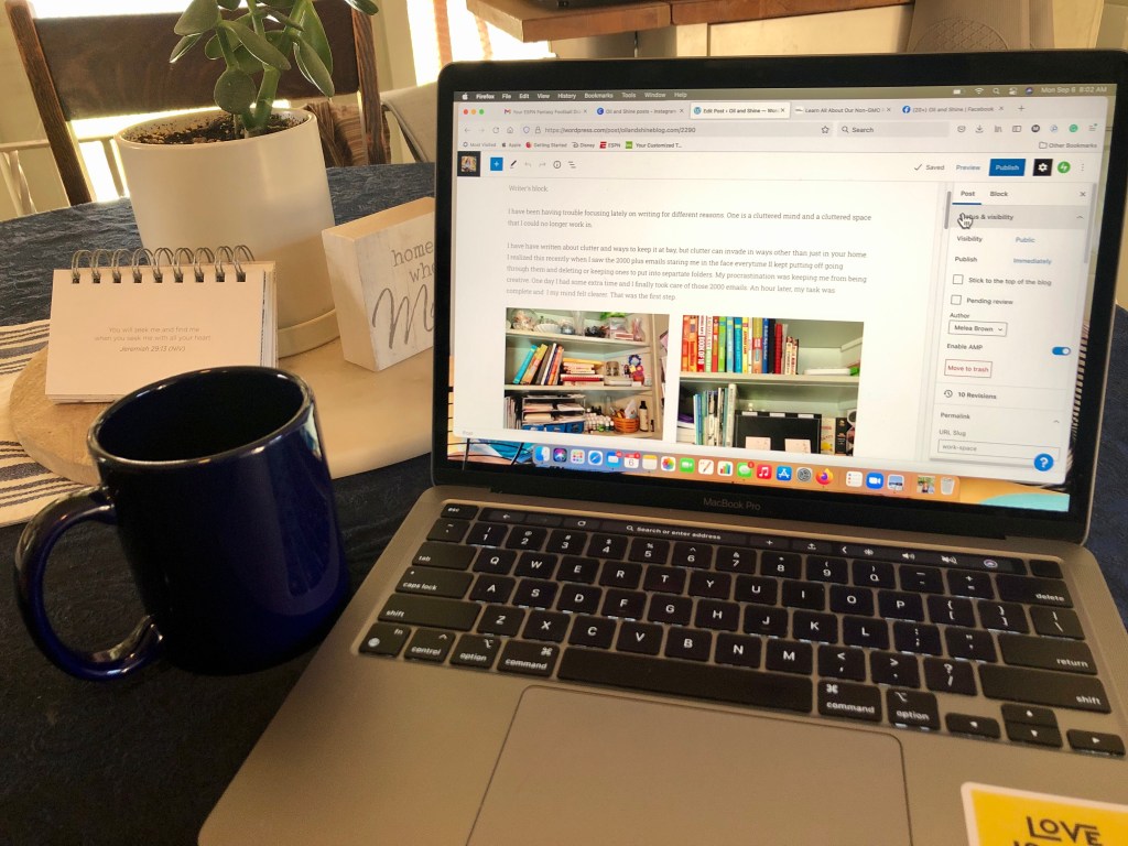 During the past few months, writing has been difficult for me. I would try to write, but I couldn’t focus. I decided to hone in on what what was keeping me from being able to work on my blog. My first discovery was admitting my favorite spot to write in had turned into one big work area. My daily planner, calendar, and home business materials kept staring me in the face. But my distractions weren’t just physical, they were mental too. Every time I looked at my phone, I noticed that I had around 2,000 unread emails in my inbox that I was avoiding. I knew I was procrastinating and it was affecting my focus. I also wasn’t taking the time to write down the goals and dreams I had floating around in my head. In other words, I let clutter invade without realizing it happened. The combination of my workspace and my mind feeling cluttered both contributed to my writer’s block, and the chaos I felt. Instead of staying frustrated, I decided to do something about my problem.