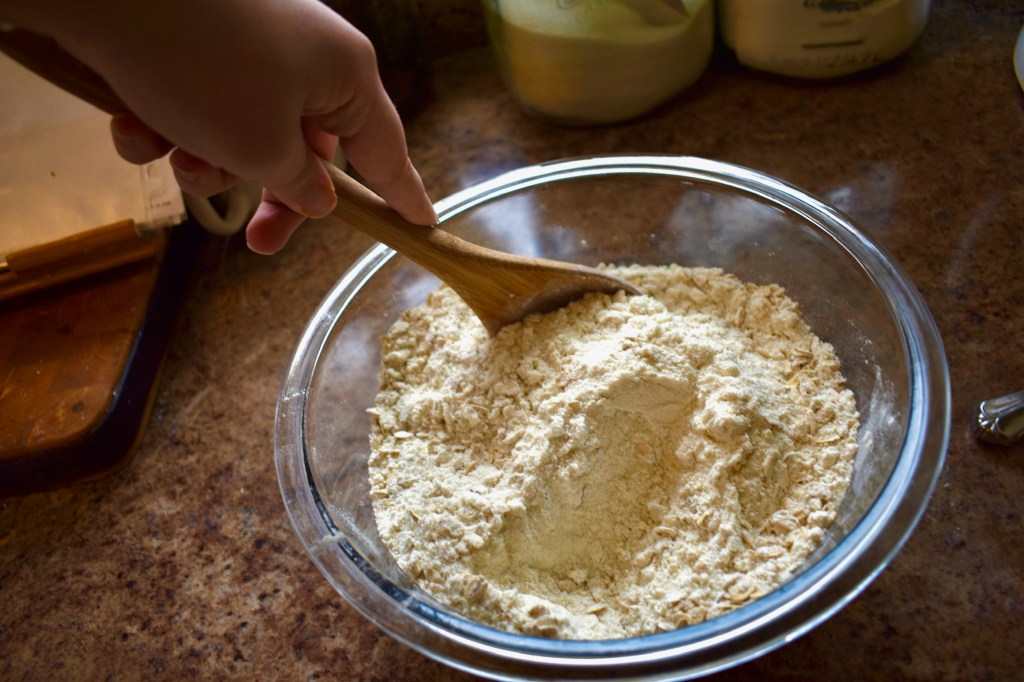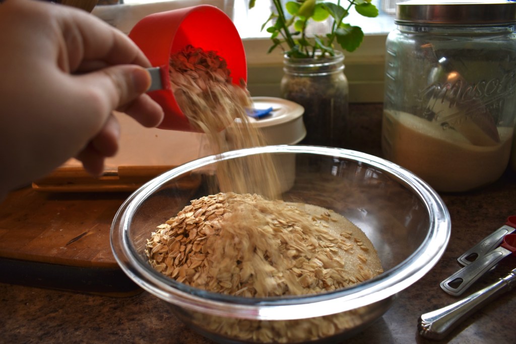 Mix 2 cups of flour, 1 teaspoon of baking soda, 1/2 teaspoon of salt, 2 cups of sugar, and 2 cups old fashioned oatmeal in a large bowl.