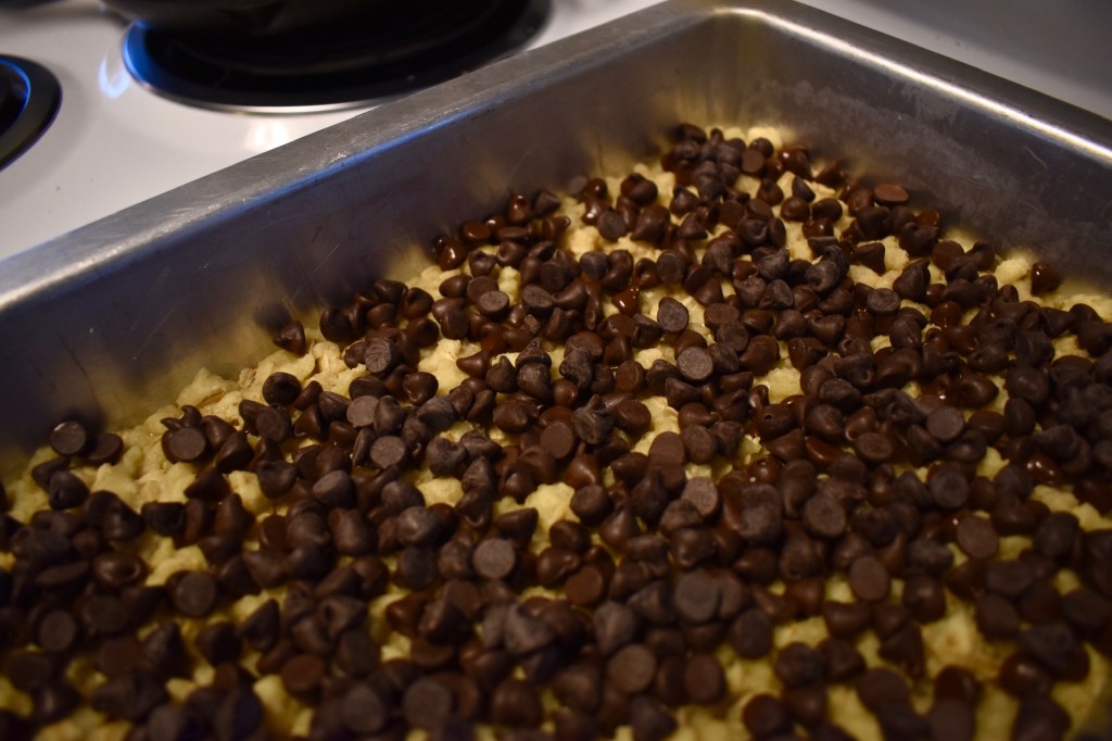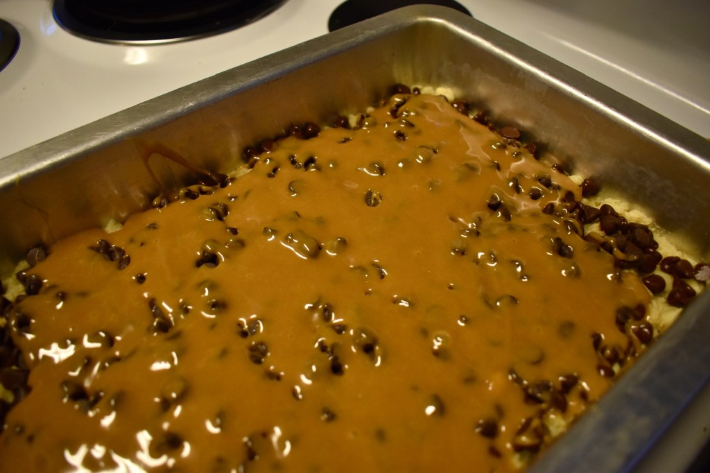 Remove pan from oven and sprinkle on top a 12 oz. package of chocolate chips and a jar of caramel topping that has been mixed with 6 tablespoons of flour.